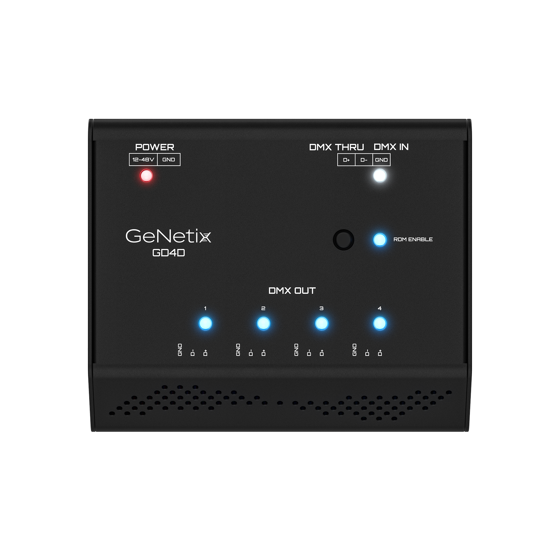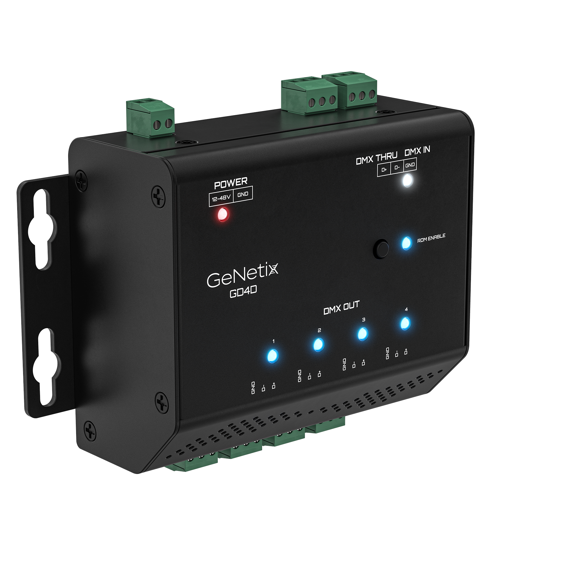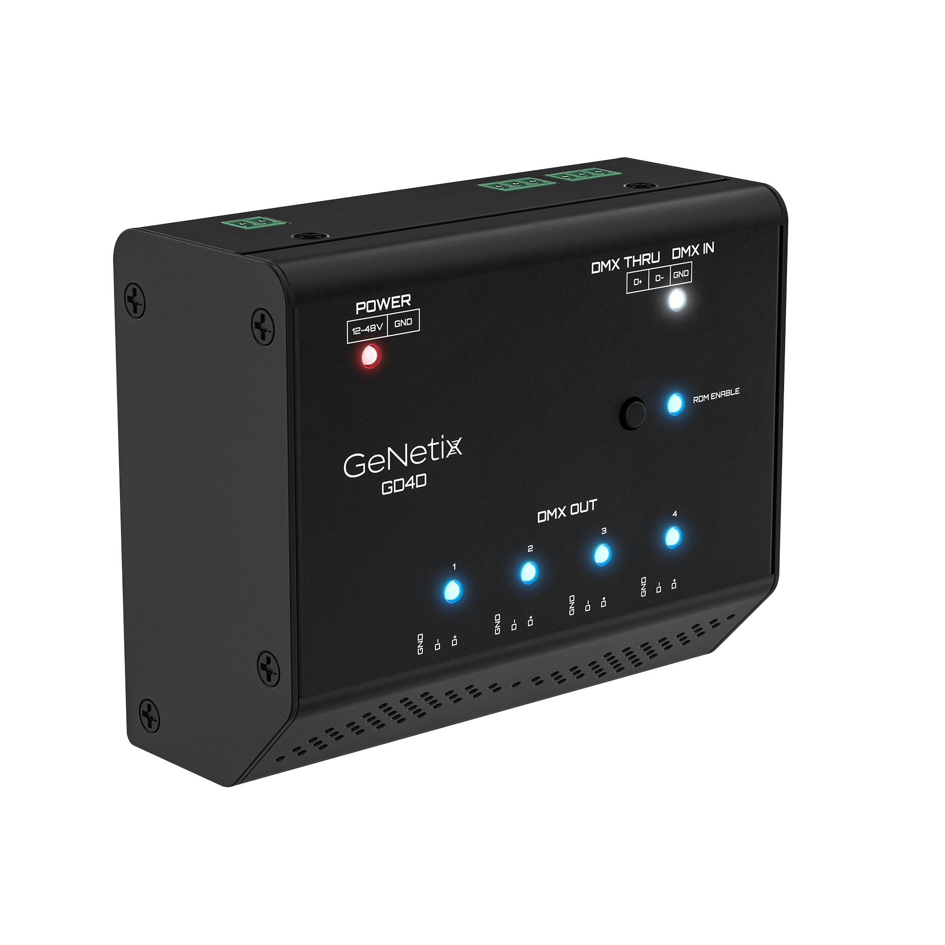 GeNetix GD4D is a DIN rail mountable RDM-capable 4-Port DMX Splitter fitted with phoenix screw terminals for DMX IN, THRU, and OUT from terminal block connectors, offering a design ideally suited to the needs of permanent installations. GD4D is powered via an external 12-48V power supply (purchased separately). GD4D features an ‘RDM Disable’ option to strip out RDM data and retime the DMX signal. LEDs provide visual indication to know if the GD4D is connected to external power, if RDM is enabled, and DMX input and output status.